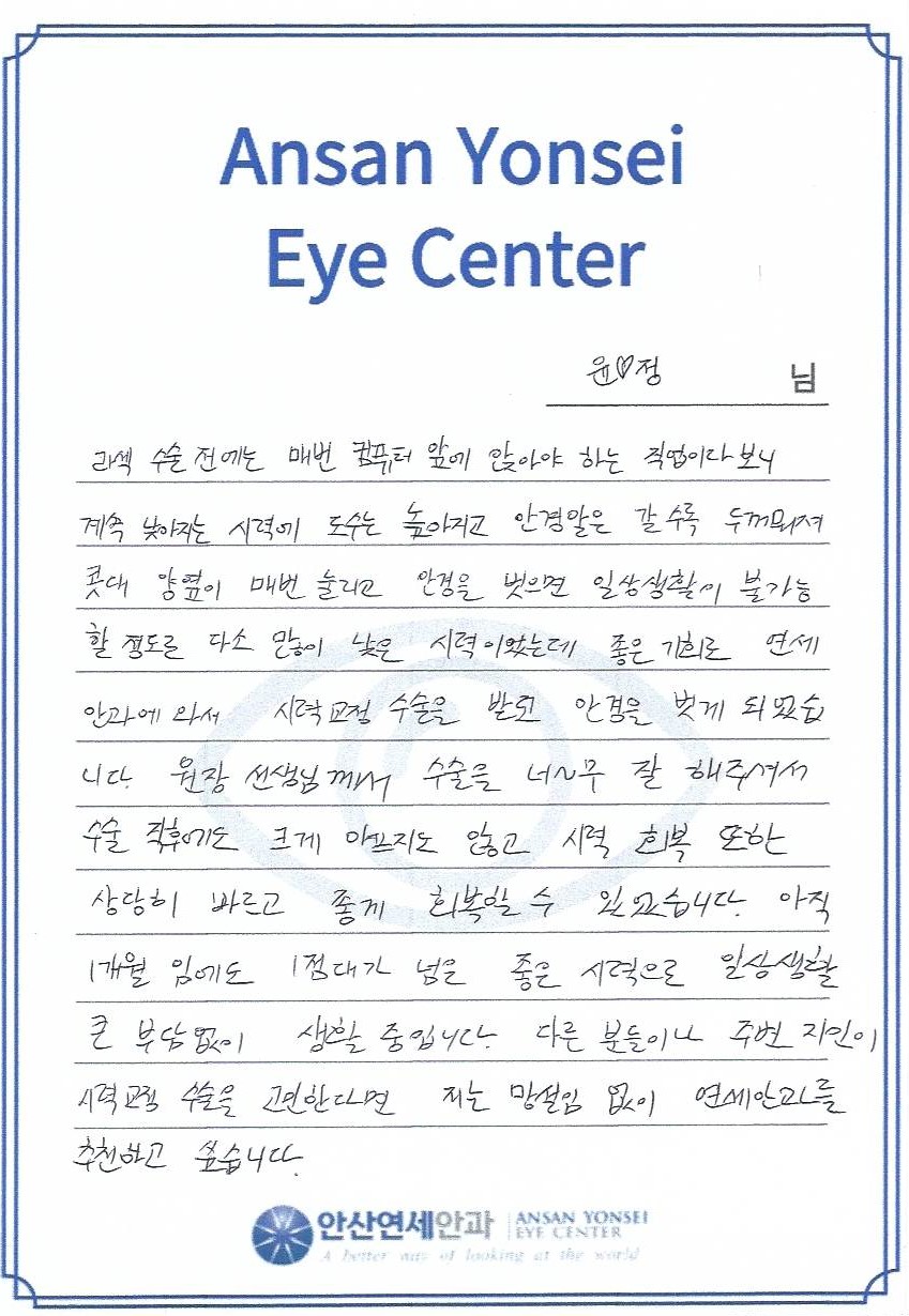 다소 많이 낮은 시력이었는데 좋은 기회로 연세안과에 와서 시력교정 수술을 받고 안경을 벗게 되었습니다.