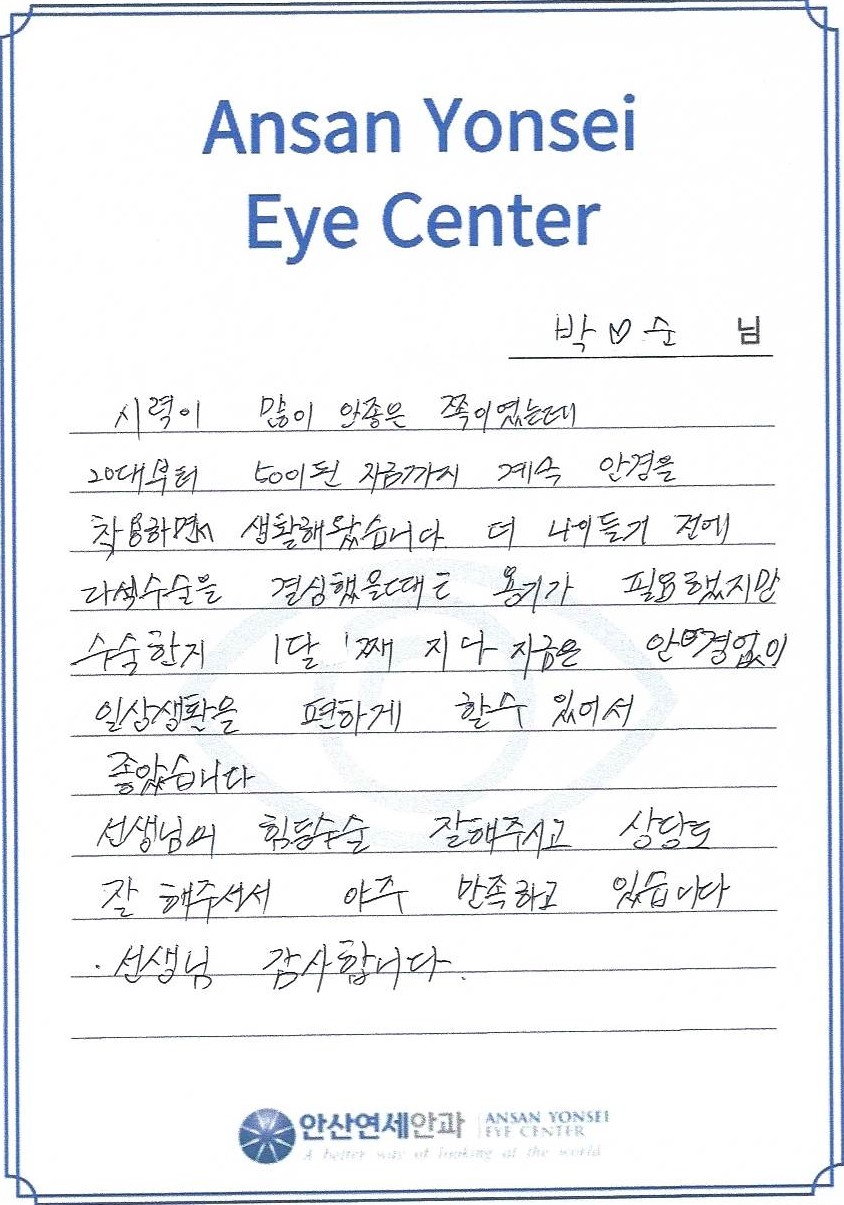 선생님의 힘든 수술 잘해주시고 상담도 잘 해주셔서 아주 만족하고 있습니다.
