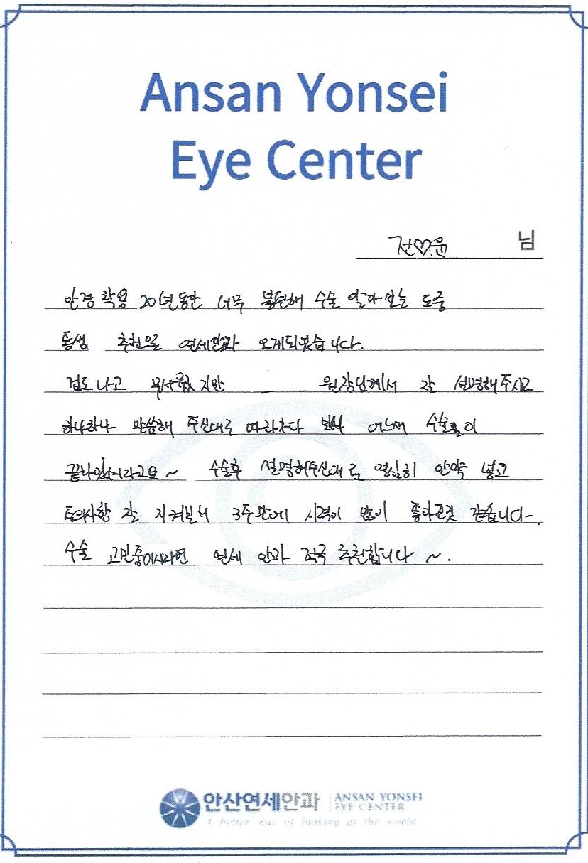 안경 착용 20년 동안 너무 불편해 수술 알아보는 도중 동생 추천으로 연세안과 오게 되었습니다.