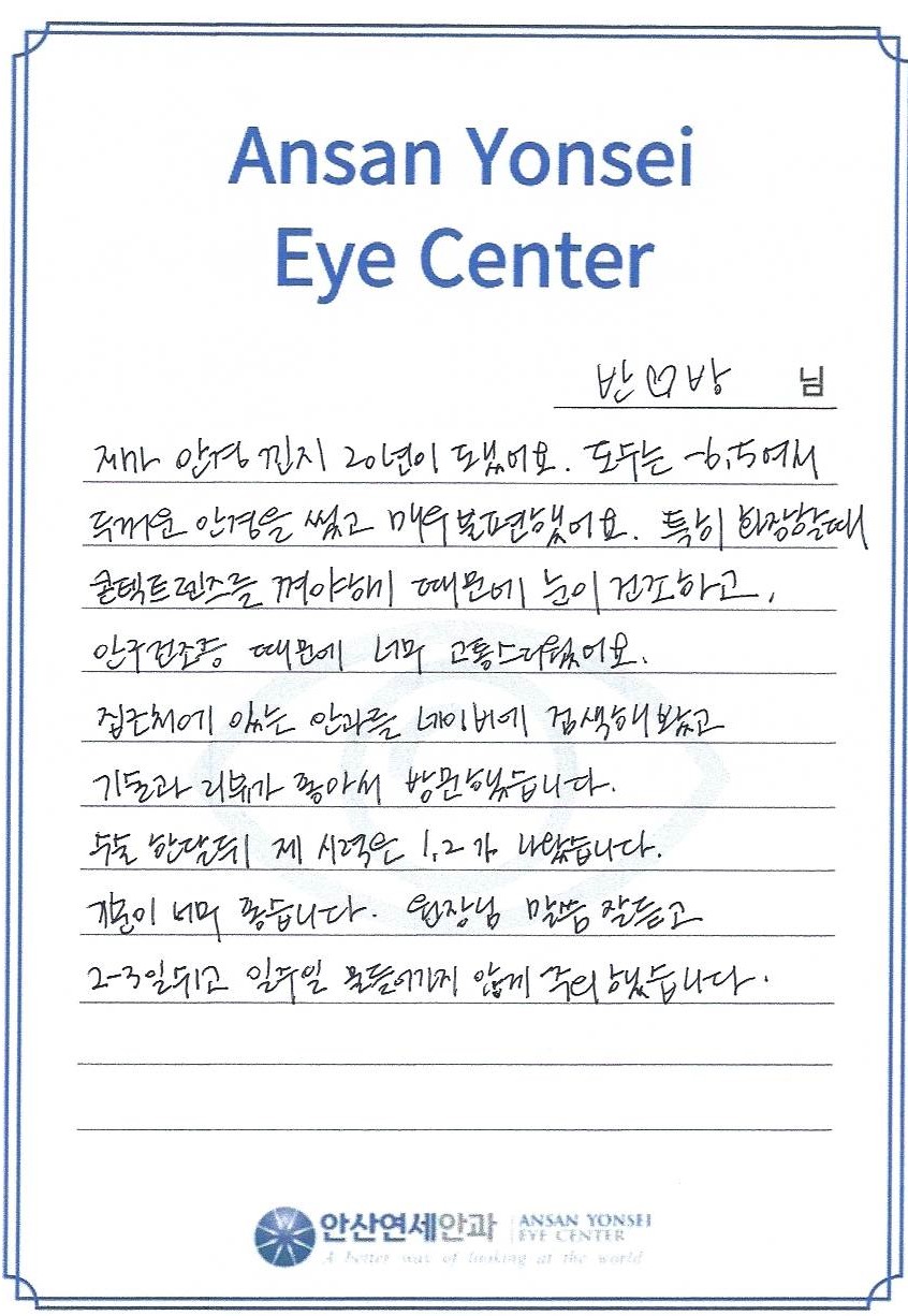 수술 한달 뒤 제 시력은 1.2가 나왔습니다. 기분이 너무 좋습니다.