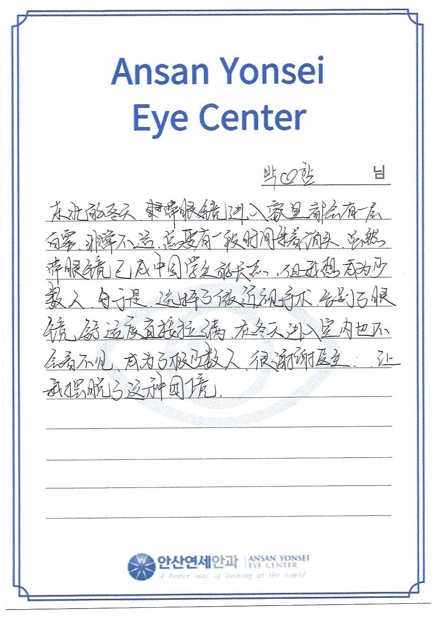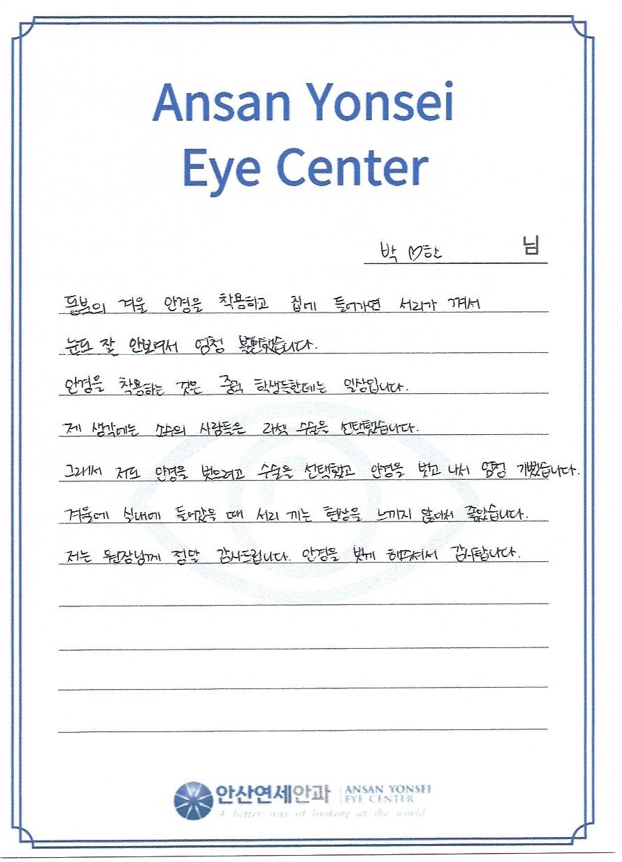 저는 원장님께 정말 감사드립니다. 안경을 벗게 해주셔서 감사합니다.