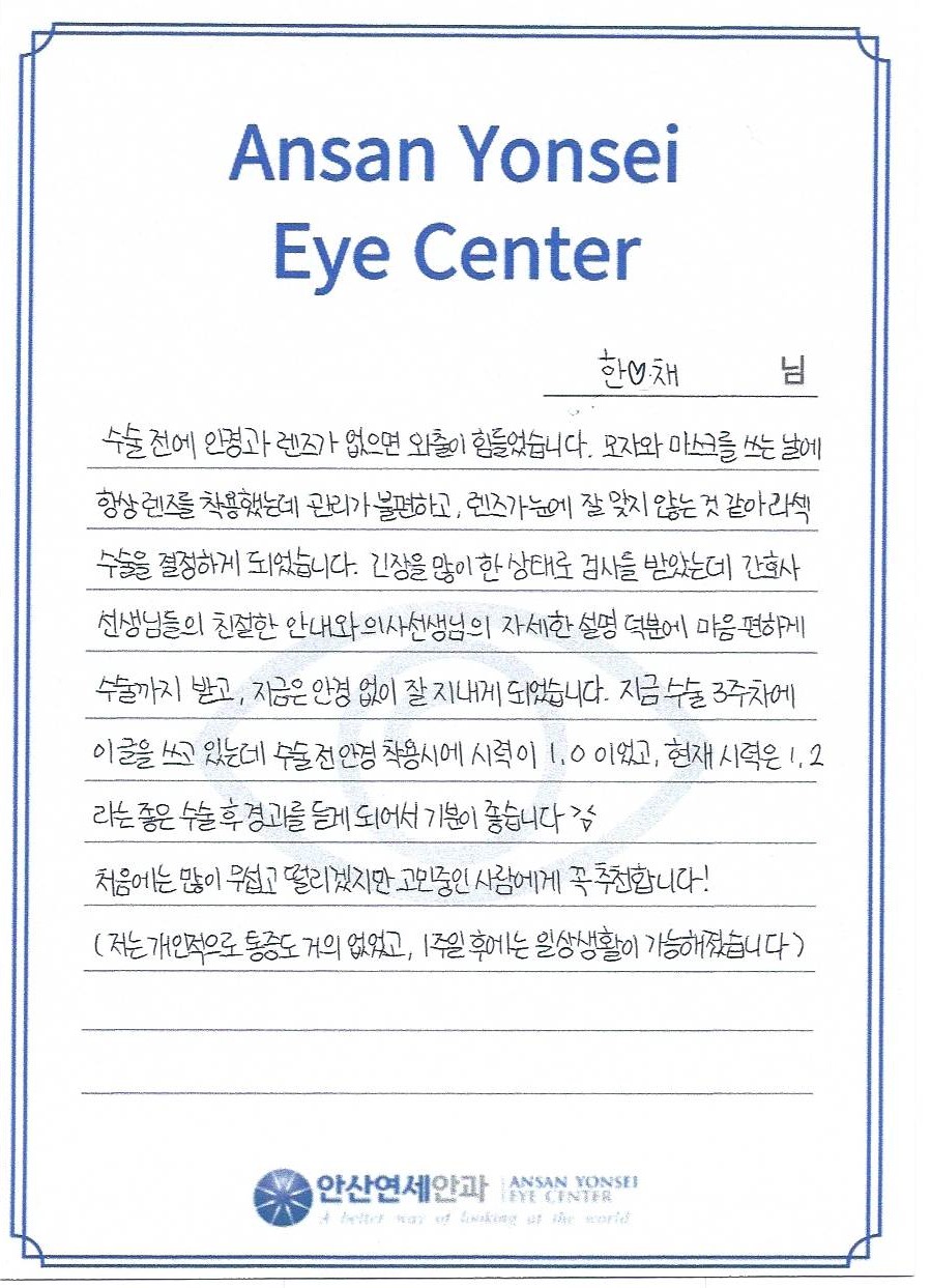 의사 선생님의 자세한 설명 덕분에 마음 편하게 수술까지 받고, 지금은 안경 없이 잘 지내게 되었습니다.