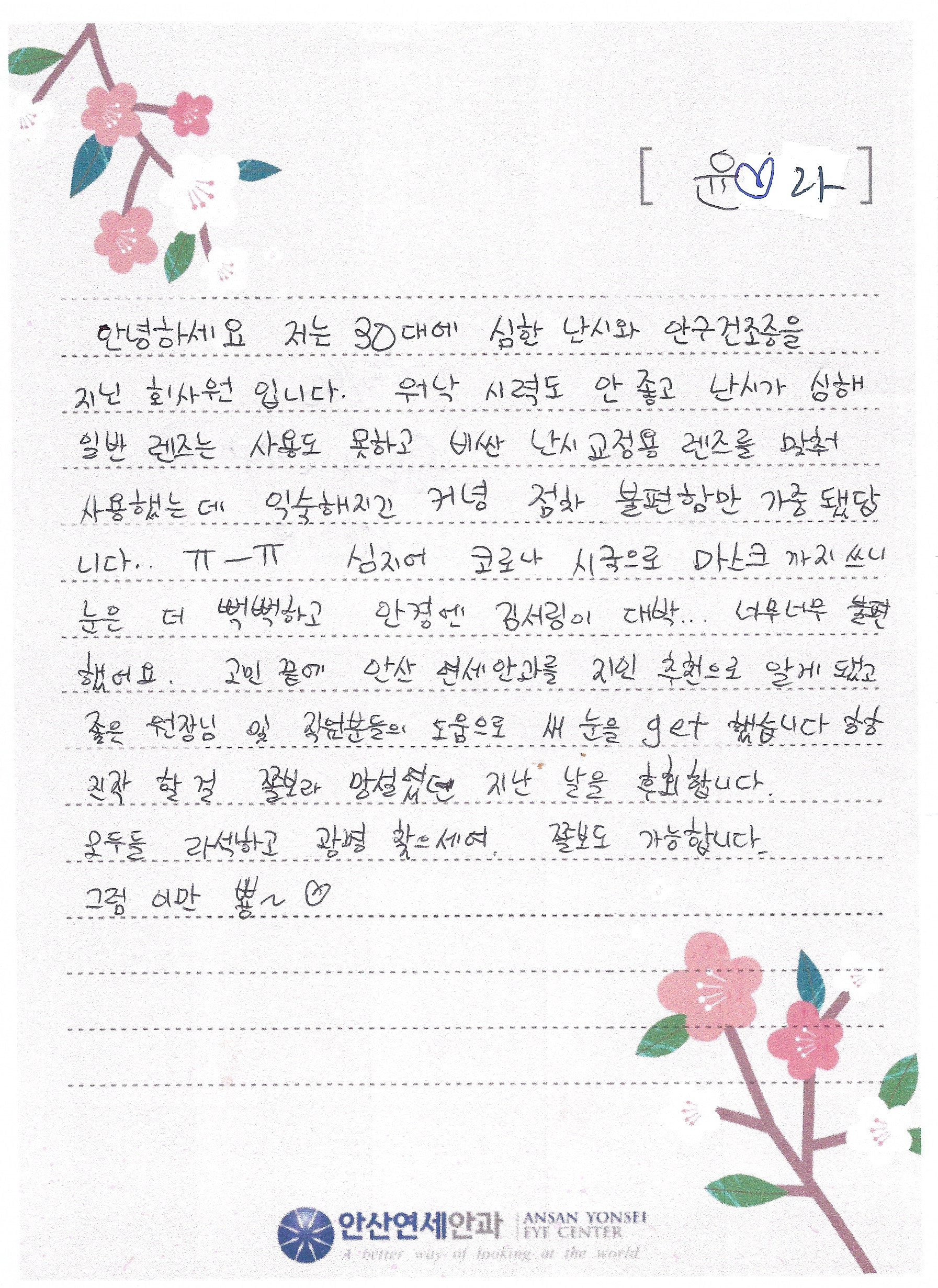 했어요. 고민 끝에 안산 연세안과를 지인 추천으로 알게 됐고