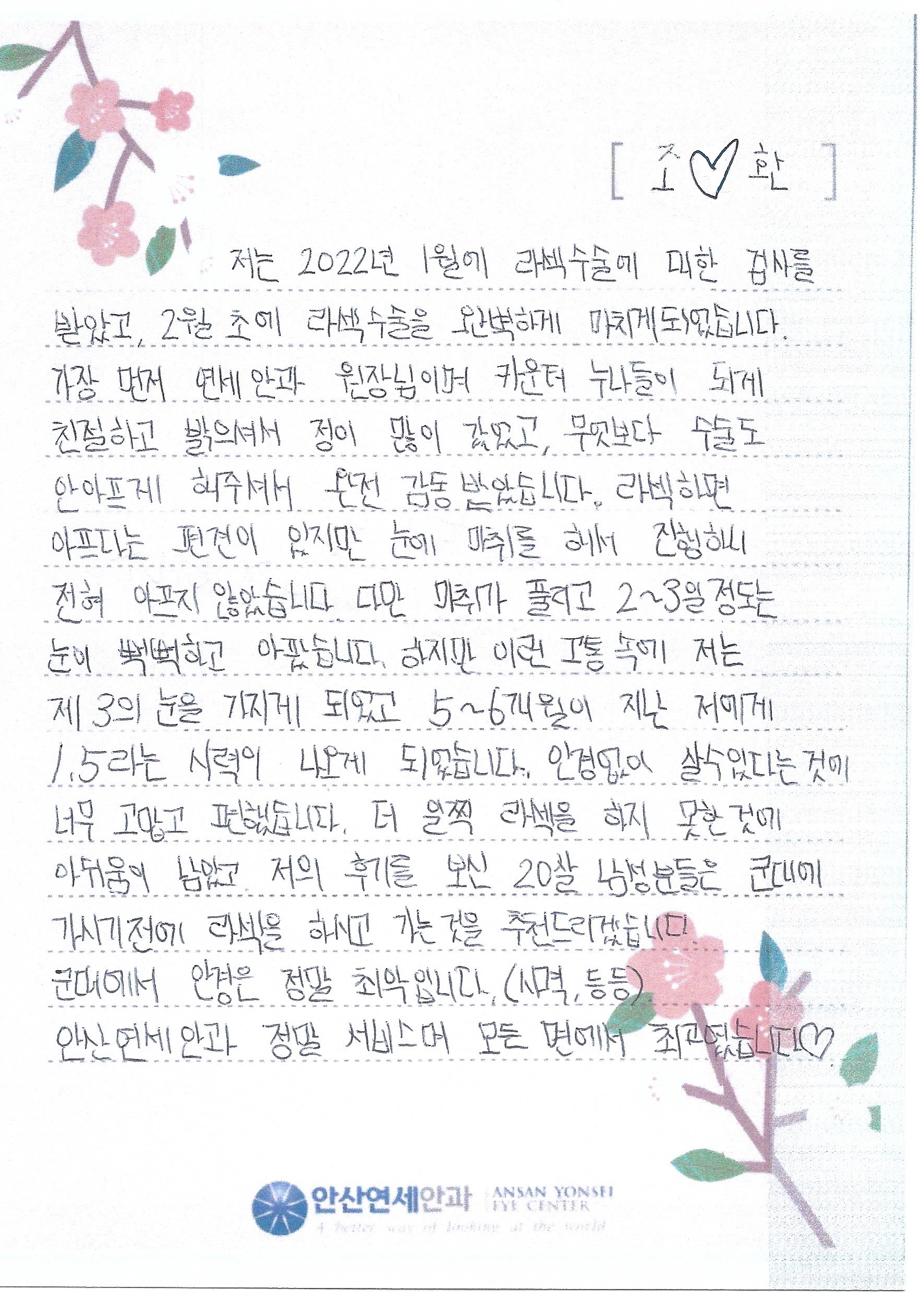 너무 고맙고 편했습니다. 더일찍 라섹을 하지 못한 것에