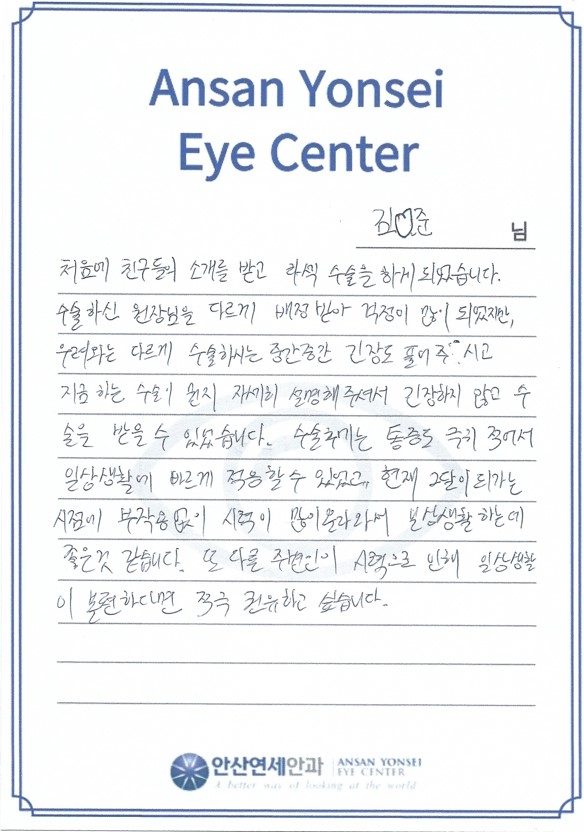 처음에 친구들의 소개를 받고 라섹 수술을 하게 되었습니다.