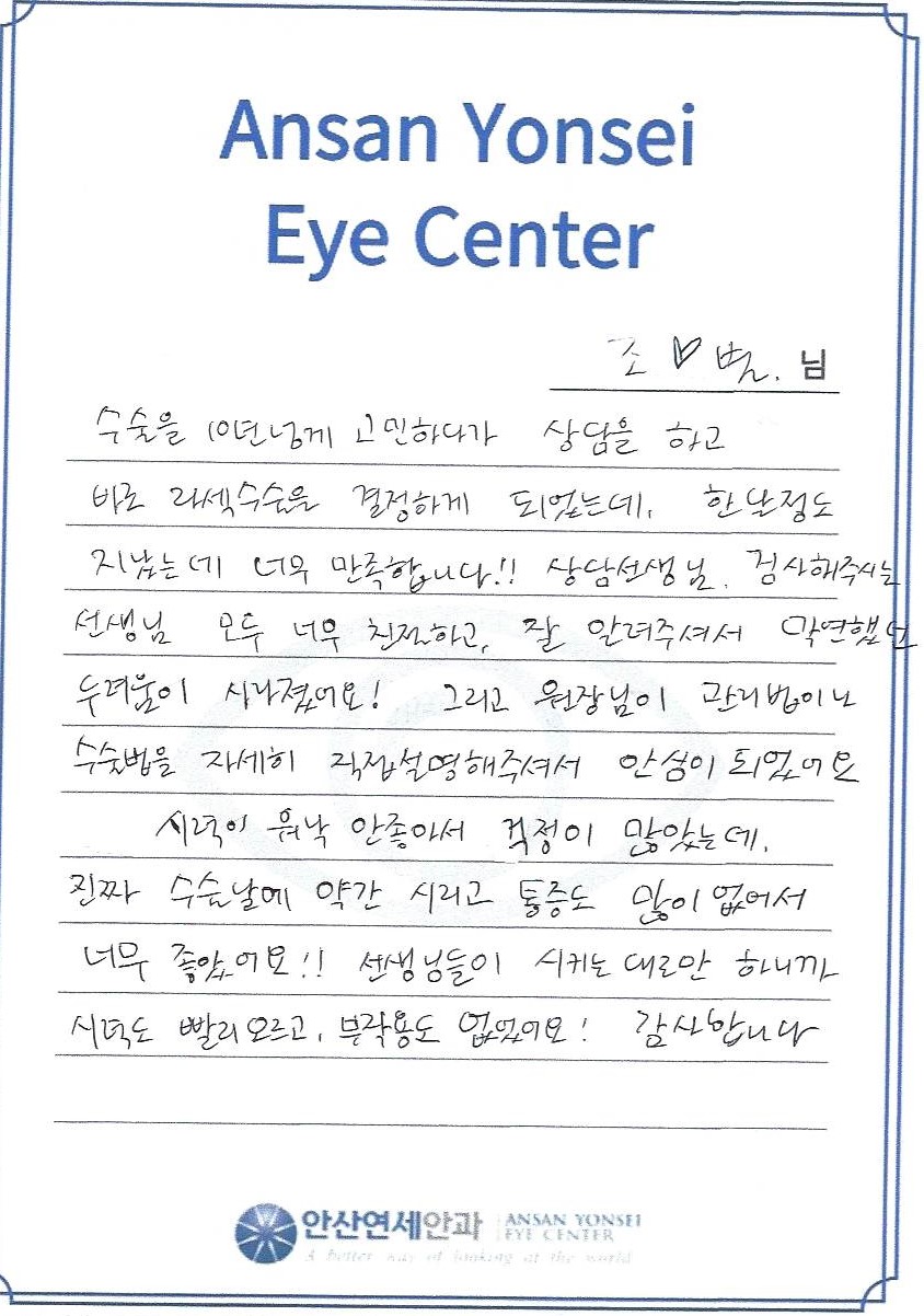 선생님들이 시키는대로만 하니까 시력도 빨리 오르고, 부작용도 없었어요! 감사합니다