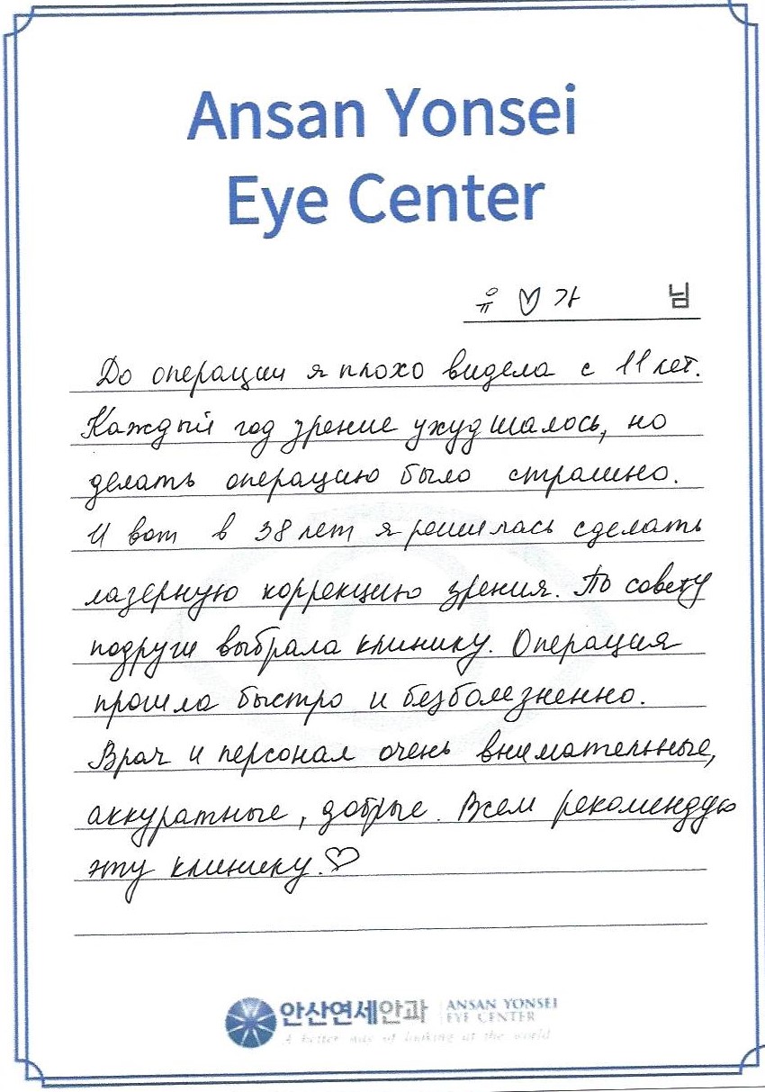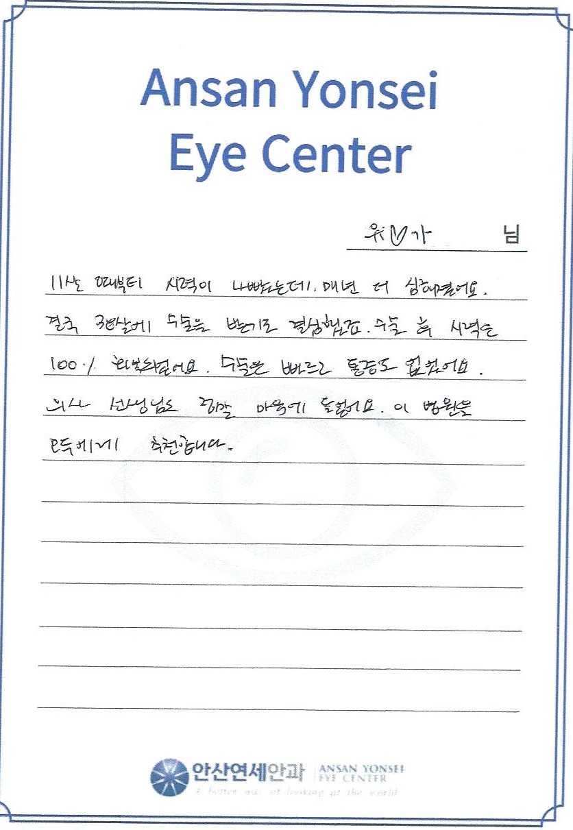 수술 후 시력은 100% 회복되었어요. 수술은 빠르고 통증도 없었어요.