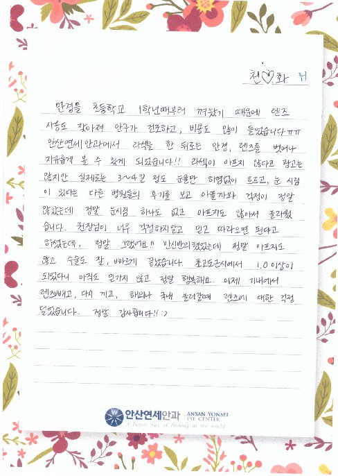 초고도근시에서 1.0이상이 되었다니 아직도 믿기지 않고 정말 행복해요.