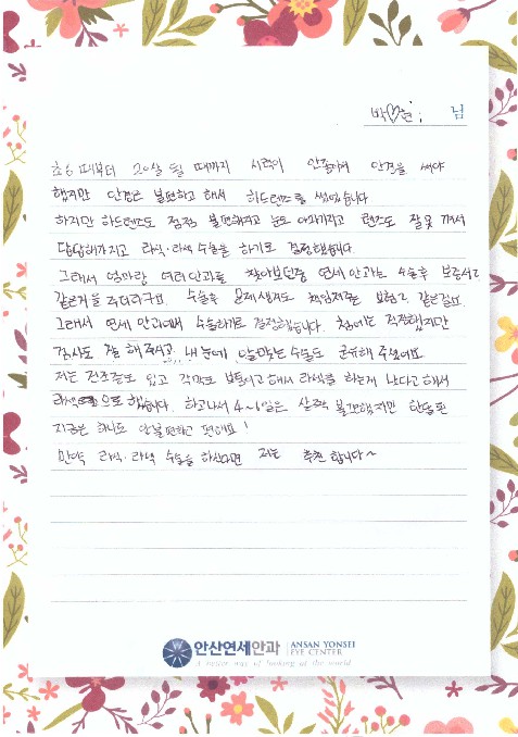 첨에는 걱정했지만 검사도 잘 해주시고 내눈에 알맞는 수술도 권유해주셨어요.