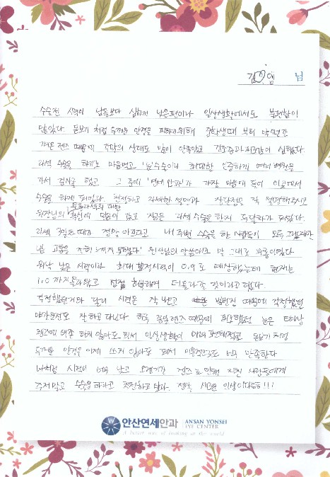 원장님의 무통라섹의 대한 확신에 믿음이 갖고 지금은 라섹수술을 한지 두달차가 되었다.