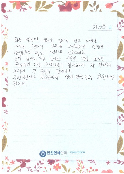 처음 병원에 방문후 검사를 받고 다음날수술을 했는데 일주일은 고생했지만 안경을 쓸때보다 훨씬 편하고 잘보이네요눈에 안약도 처음 넣어보고 수술에 겁이 났지만원장님과 다른 선생님들이 친절하게 잘 안내해주셔서 잘 끝난거 같습니다.주변지인이나 가족들에게 안산연세안과 추천해야겠어요.