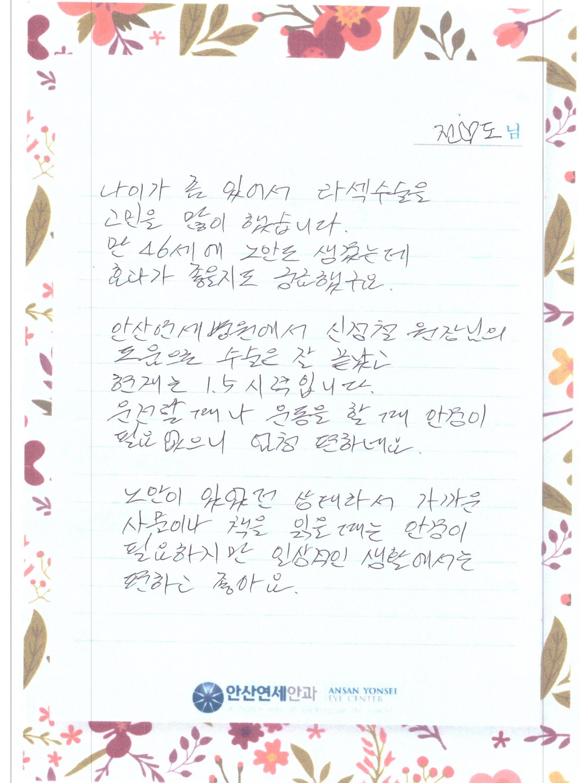 안산연세병원에서 신정철 원장님의도움으로 수술은 잘 끝났고현재는 1.5시력입니다.운전할때나 운동을 할때 안경이 필요 없으니 엄청 편하네요.