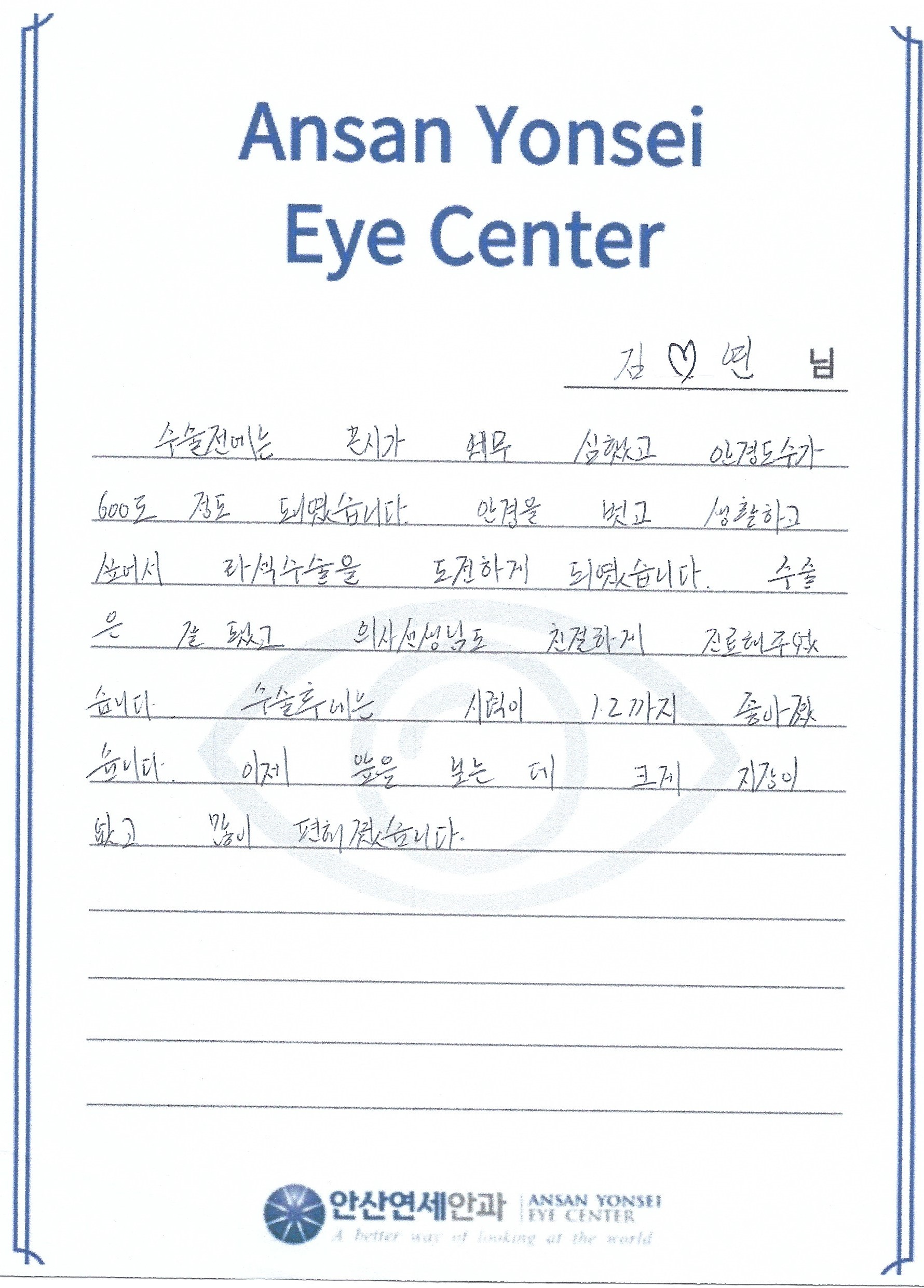 M 라섹 이제 앞을 보는 데 크게 지장이 없고 많이 편해졌습니다.
