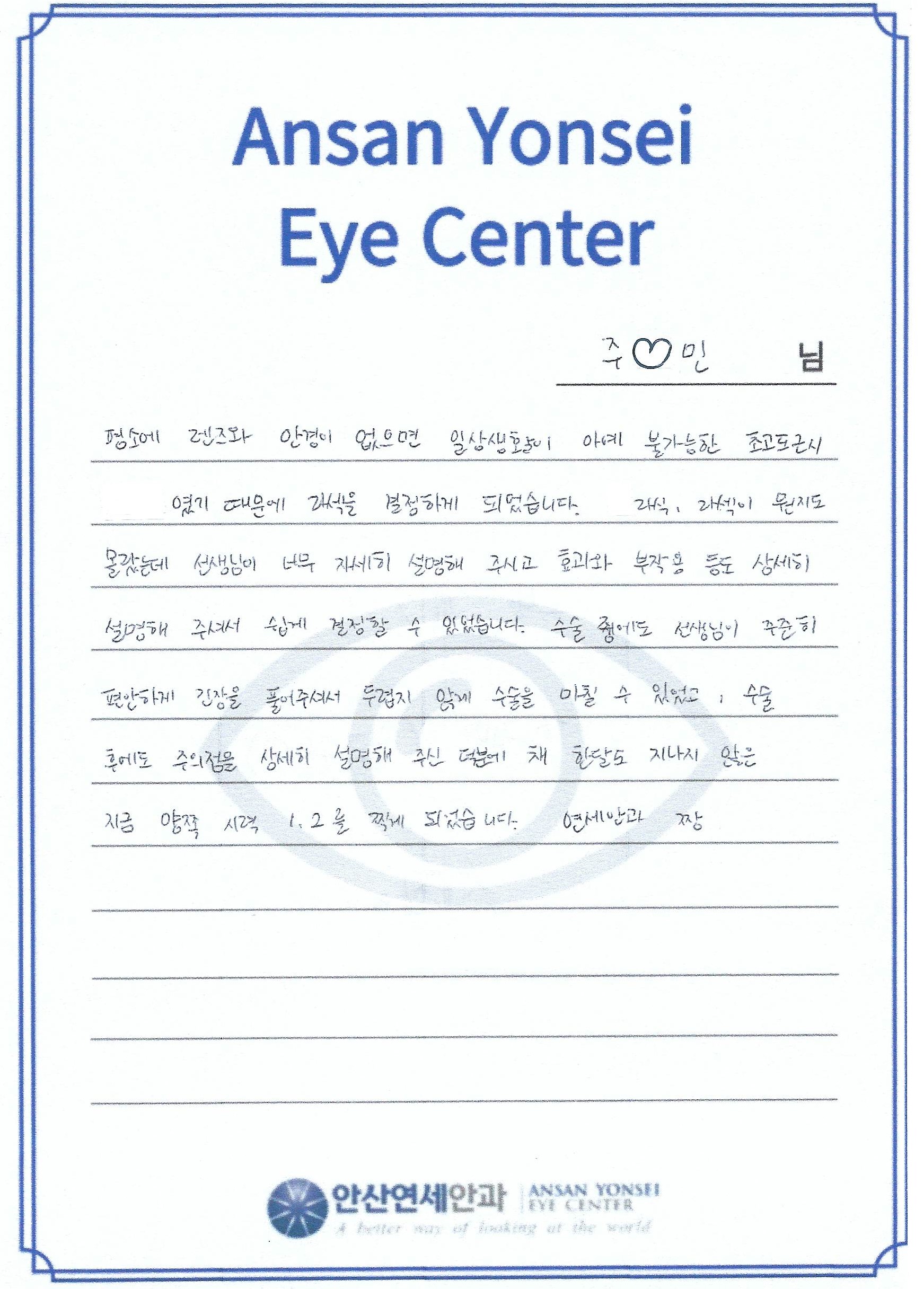 지금 양쪽 시력 1.2를 찍게 되었습니다. 연세안과 짱!