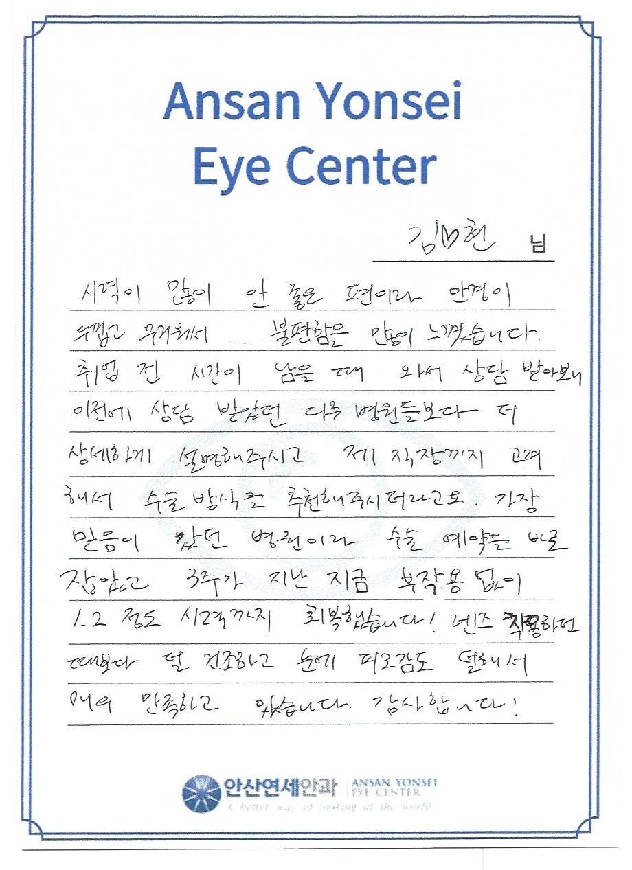 M 라섹 1.2 정도 시력까지 회복했습니다! 렌즈 착용하던 때보다 덜 건조하고 눈에 피로감도 덜해서 매우 만족하고 있습니다. 감사합니다!