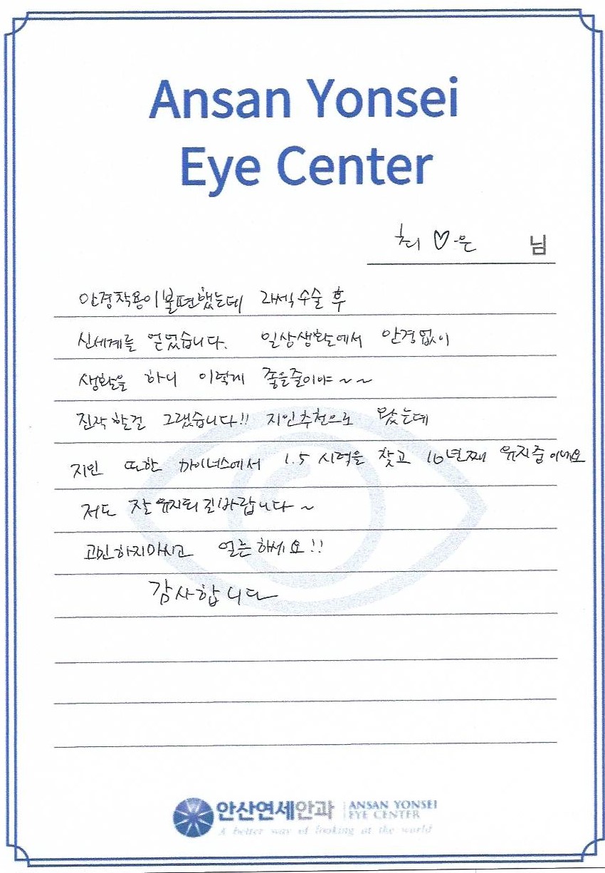 안경 착용이 불편했는데 라섹 수술 후 신세계를 얻었습니다.