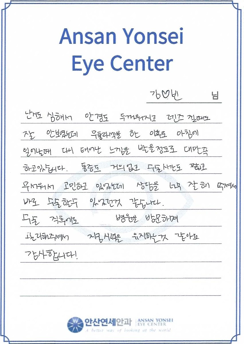 수술 직후에도 병원을 방문하며 관리해주셔서 지금 시력을 유지하는 것 같아요. 감사합니다!